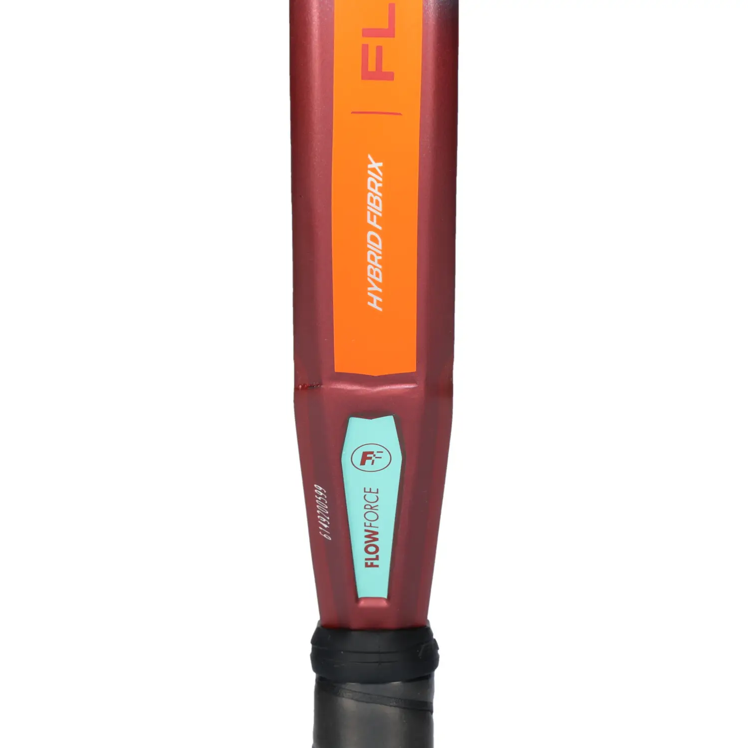 Bullpadel Flow Pro 2022 destaca por su mezcla de colores vibrantes como el turquesa, el rojo y el naranja. El degradado en el fondo del plano y el logo de Bullpadel en el centro aportan un toque moderno y sofisticado, mientras que el puño negro contrasta elegantemente. Es una pala visualmente impactante que refleja la fuerza y personalidad de las jugadoras que la empuñan.
